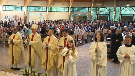 Der Trierer Bischof Stephan Ackermann zelebrierte in der Schönstätter Pilgerkirche mit drei weiteren Priestern den Festgottesdienst zum 80. Geburtstag der Schönstätter Marienschule. In seiner Predigt ermunterte er die Schülerinnen nicht nur mit, sondern auch mal gegen den Strom zu schwimmen.