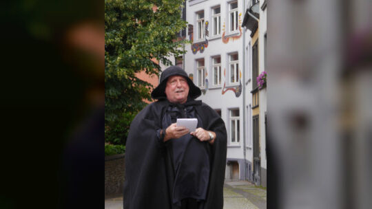 Mit einem schwarzen Umhang bekleidet erzählt Stadtführer Jürgen Frensch bei seiner Führung von den Schattenseiten der Stadt. Peter Karges
