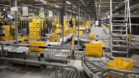 Gelbe Kisten bahnen sich auf Rollen ihren Weg durchs Briefzentrum Koblenz. Beladen sind sie natürlich mit Post. Matthias Kolk