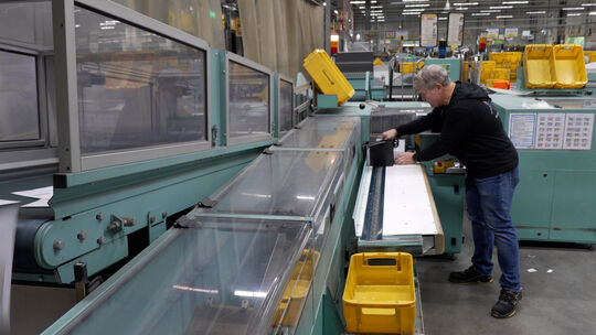 Frank Birkhof richtet im Briefzentrum Koblenz einige Briefe kantengleich aus. Svenja Wolf