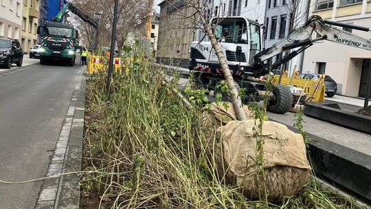 Die Wurzelballen sind dick eingepackt, als die Bäume nach und nach vom Lkw gehievt werden: Auf der Mittelpromenade in dem Abschnitt zwischen Roonstraße und Markenbildchenweg werden weitere 54 Vogelkirschen gepflanzt, wie sie bereits im Bereich zwischen Friedrich-Ebert-Ring und Roonstraße stehen.