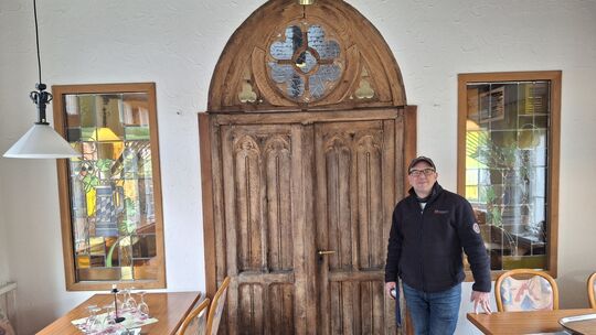 Noch-Pächter Roberto Möckel vor einer nachträglich eingebauten Kapellenpforte, die man selbstverständlich auch erwerben kann. Alexander Thieme-Garmann