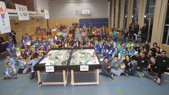 Die GSG Robots (Blaus Shirt, grüne Hüte) sind die Sieger beim Regionalwettbewerb der First Lego League Challenge, zweiter wurden die türkis gekleideten HackerFriends rechts in der Mitte. Winfried Scholz