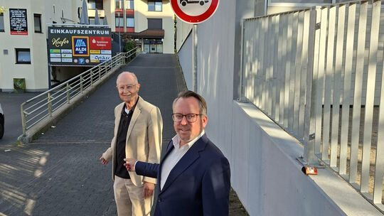 Stephan Wefelscheid (rechts) und Edgar Kühlenthal in der betroffenen Fußgängerzone der Karthause, die einen Poller erhalten soll. Gudrun Kühlenthal