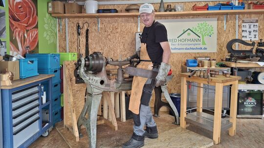 Manfred Hofmann aus Singhofen/Taunus führte beim Kunsthandwerkermarkt in der Koblenzer Schlossstraße eine historische Metalldrückbank vor. Alexander Thieme-Garmann