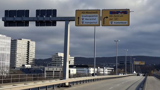 Seit Donnerstag weisen neue Schilder auf der Kurt-Schumacher-Brücke in Koblenz auf die "neuen" Verkehrsbeziehungen hin. Alexander Thieme-Garmann