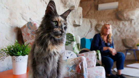 Die Katzen, die in Janas Café zu Hause sind, lieben den Kontakt zu Menschen. Auch Prinzessin, die Main-Coon auf dem Bild, begrüßt jeden neuen Besucher mit Neugier und Vorfreude. Kevin Ruehle