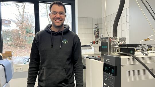 Gaschromatograph, Massenspektrometer, Thermowaage und Infrarotspektrometer: Gianluca Reif weiß mit der hochkomplexen Gerätekopplung umzugehen. „Mit diesem Gerät können wir die stofflich bedingte Wahrheit von Keramiken finden“, sagt der Promovierende. Hannah Klein
