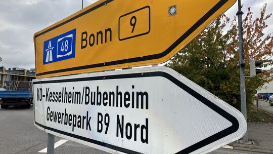 Ein Schild im Koblenzer Industriegebiet in Kesselheim weist den Weg zum Gewerbepark an der B9: Hier wird jeweils Wertschöpfung betrieben, die auch zu Gewerbesteuereinnahmen für die Stadt führt. Peter Meuer