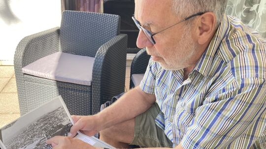 Wir haben Pitt Elben beim Besuch seines Vaters Theo Elben in Rübenach getroffen. Er zeigt anhand einer alten Ortsaufnahme, wie groß einst das Schilfareal war, das ihm als Kind als Abenteuerspielplatz diente. Fotos: Katrin Steinert Katrin Steinert