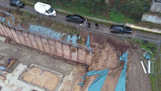 Bleibt vom Koblenzer Luxusbauprojekt Maiblick Living nur eine Baugrube übrig? Anwohner hatten diese Szene nachgestellt, um zu zeigen, wie schmal der Zufahrtsweg ist. Rhein-Zeitung