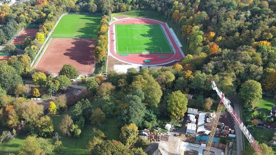 Auf der Koblenzer Karthause sind zwei Mehrfamilienhäuser geplant (im Bild rechts unten). Doch die Arbeiten ruhen seit Mitte Juli. Im Hintergrund ist die Sportanlage Schmitzers Wiese zu sehen. Rhein-Zeitung