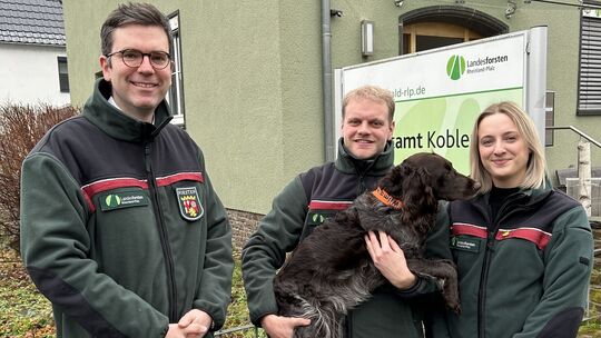 Forstamtsleiter Sebastian Schmitz (links) freut sich auf die Zusammenarbeit mit dem Ehepaar Ann-Kathrin und Jonas Frings. Sie haben Hündin Wilma dabei. Landesforsten.RLP.de/Dietmar Ebi. Landesforsten.RLP.de / Dietmar Ebi