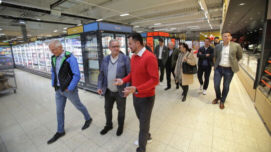 Marktleiter Alexander Bambuch (roter Pullover) führt die Gäste durch die neue Kaufland-Filiale. Ingo Beller