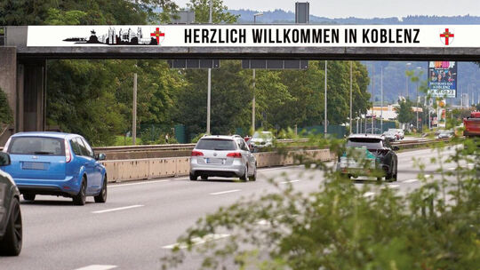 Koblenz erhält ein neues Willkommensschild an der B9: Das Schild an der ehemaligen Eisenbahnbrücke über der Bundesstraße ist fertiggestellt und wird noch in diesem Jahr erneuert, teilt die Stadt in einer Pressemeldung mit. Seit 1992 begrüßt es stadteinwärts die Gäste mit „Willkommen in Koblenz“ und verabschiedet sie stadtauswärts mit „Auf Wiedersehen in Koblenz“.