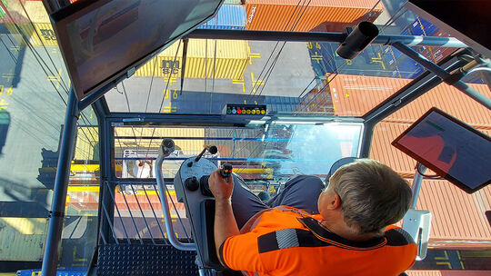 Kranführer Paul Steinhauer verlädt seit 22 Jahren Container auf und von den Schiffen im Andernacher Hafen. In 20 Metern Höhe bedient er den Spreizer aus seiner Kanzel per Joystick. Bis zu 45 Tonnen kann er so an den Haken nehmen. Stefan Lieser
