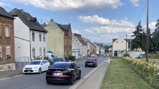An dieser Durchgangsstraße in Koblenz-Rübenach, wo rechts der Strommast steht, soll eine Sammelstelle für Glas und Altpapier entstehen. Da gegenüber (links) immer Autos an der Aachener Straße vor den Häusern parken, hat ein Anwohner vor einem Verkehrschaos gewarnt. Katrin Steinert