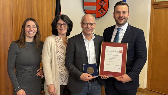 Peter Dennert (2. von rechts) bekam beim Bürgerempfang in Brey die Ehrenplakette verliehen. Er gilt als Problemlöser im Ort. Ebenfalls im Bild (von links): Lena Schuth (Erste Beigeordnete), Anja Dennert (Ehefrau von Peter Dennert) und Christian Schuth (Ortsbürgermeister, links). Elke Schuth