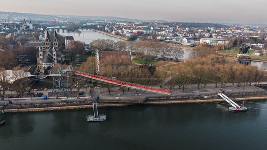Auf der Behelfsbrücke hoch über dem Rhein arbeiten die Fachleute und verweben die Seilstränge miteinander. Marc Zimmer / Janko.Media GmbH für Seilbahn Koblenz
