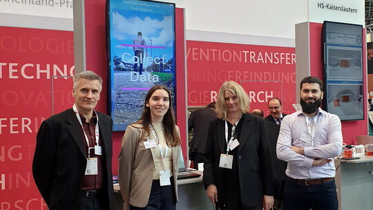 Am Messestand in Düsseldorf (von links): Prof. Uwe Jaekel, Alina Burgert, Prof. Babette Dellen und MohamedAlbahri Foto: Hochschule Koblenz/Jakob Tenholt Hochschule Koblenz/Jakob Tenholt