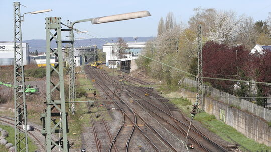 Ungefähr in Höhe der grün bewachsenen Fläche (Mitte, rechts) soll der Bahnhaltepunkt errichtet werden. Von dort aus soll in rechter Richtung der Rheinwalk zur Stadtmitte führen. Ganz rechts sieht man noch ein Gebäude des städtischen Bauhofs. Winfried Scholz