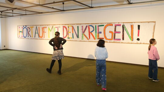 Mit einem riesigen Plakat fordern die Kinder, die Kriege zu beenden. Winfried Scholz