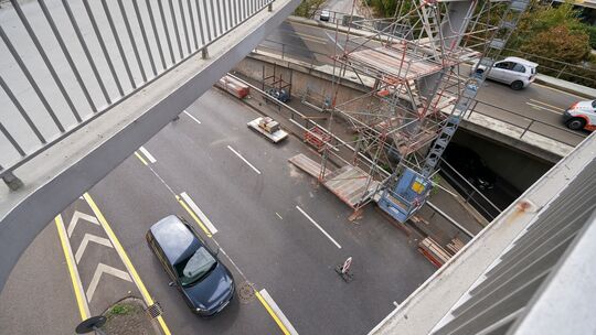 An der Fußgängerbrücke über den Moselring wird gearbeitet. Der Verkehr kann zwar an den Gerüsten vorbeigeführt werden, zu Behinderungen vor allem in der Rush Hour kann es aber kommen. Fotos: Sascha Ditscher