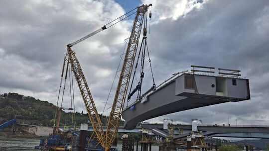 Auf den kurzen und knackigen Namen „Schuss 1“ hört das Brückenstahlbauteil, das am Montagnachmittag auf die neu errichteten Brückenpfeiler und gelben Hilfskonstruktionen der neuen Pfaffendorfer Brücke eingehoben wurde. Bereits am Morgen war der Koloss mit dem Schiff aus Mannheim angeliefert worden.
