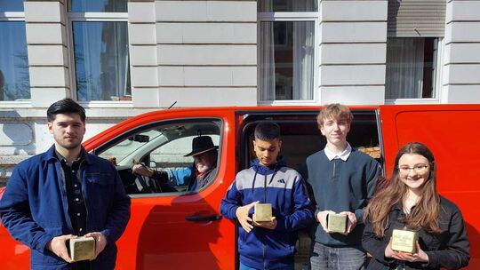 Die Schüler der Arbeitsgruppe "Demokratie leben" (von links): Ion Baleca, Yasir Mahmood, Nikita Hertner und Canan Bulunc. Im Hintergrund ist der Künstler Gunter Demnig zu sehen. Frauke Rittscher