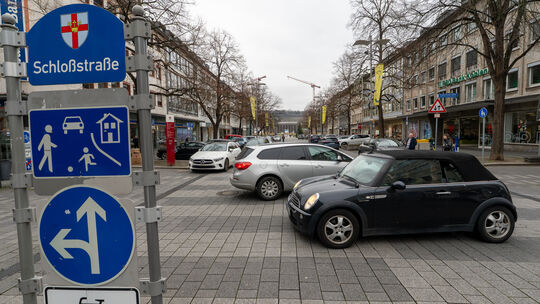 Der östliche Teil der Schlossstraße ist momentan ein verkehrsberuhigter Bereich. Um Autofahrer von der Fahrradstraße zu verdrängen, überlegt die Stadt, die Fußgängerzone auszuweiten. Mirco Klein