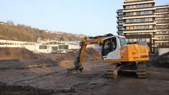 Neben dem Hochhaus der EVM in der Schützenstraße baut die Firma Goldbeck für den Energieversorger eine neue Lagerhalle und ein neues Bürogebäude. Matthias Kolk