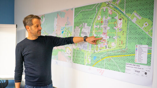 Oliver Vordemvenne, Geschäftsführer von I-Motion, erklärt im Gespräch mit unserer Redaktion, wie es dazu kam, dass die Nature One im Gewerbepark Mülheim-Kärlich geplant wird. Hier zeigt er auf die Übersichtskarte der Nature One 2024. Alexej Zepik