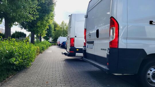 In Reih und Glied stehen einige Kleintransporter auf der Parkfläche an der August-Thyssen-Straße im Gewerbepark an der B9 vor Hornbach. Von vorne sieht alles normal aus: parkende Transporter eben. Von hinten sieht man allerdings: Die Fahrzeuge ragen zum Teil sehr weit in den Gehweg herein.