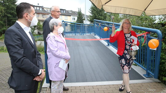 Gemeindereferentin Dorothee Hoffend (rechts) segnet die neue Brücke. Am Sonntag dabei: Gisela Schad, OB Langner (vorn) und Heinz Pauli. Foto: wfs Winfried Scholz