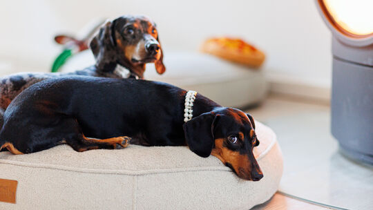 Sanft flackert das Feuer im Kamin, das orangefarbene Licht fällt auf ein Hundekissen, das vor dem Ofen auf dem Boden liegt. Zwei Dackel – eine schwarz-braune Hündin und ein gefleckter Rüde – kuscheln sich aneinander. Die Dackeldame trägt ein Perlenhalsband, der ein oder andere wird sie erkennen: Es ist Wilma, die vor drei Jahren deutschlandweite Schlagzeilen machte, als sie in einem Karton in einen Koblenzer Dönerladen geworfen wurde.