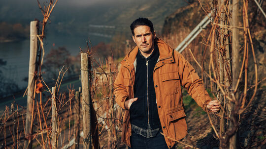 Winzer Matthias Knebel aus Winningen ist stolz auf den Titel "Weingut des Jahres" im Anbaugebiet Mosel. An der Terrassenmosel sind er und seine ausgezeichneten Weine zu Hause. Peter Bender. VDP-Weingut Knebel