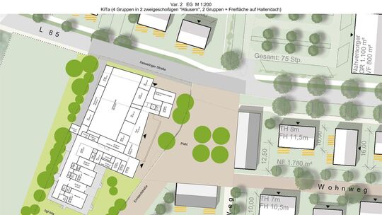 Blick in die Machbarkeitsstudie zum Kombibau von Dorfgemeinschaftshaus und Kindertagesstätte auf der Ecke Ermlandstraße/Kesselinger Straße. Rechts die Planung für das neue Wohngebiet auf dem ehemaligen Brohl Wellpappe-Gelände. Planquadrat/ Peter Sandfuchs. „Planquadrat“/ Peter Sandfuchs