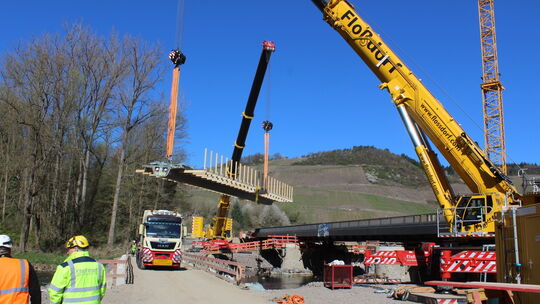 Am Montag ist die Erste von zehn Brücken, auf denen Bahnstrecke und Ahrtalradweg gemeinsam verlaufen, eingehoben worden: die Lentert-Brücke zwischen Marienthal und Walporzheim.