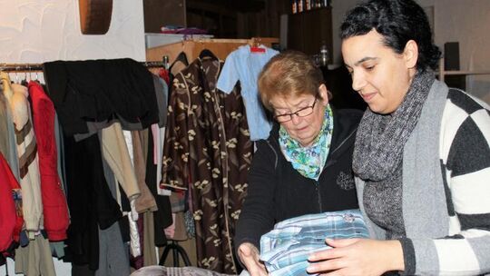 Das Flüchtlingsnetzwerk Altenahr betreibt seit einiger Zeit eine gut ausgestattete Kleiderkammer in Kirchsahr. Thekla Kräuter hilft Nadwa Al Moustafa aus Syrien, passende Hemden für den kleinen Hassan zu finden. Foto: Walden/Flüchtlingsnetzwerk Altenahr