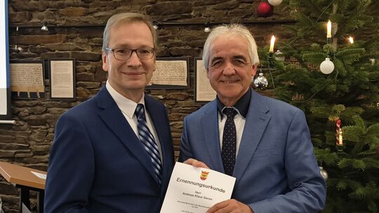 Ein besonderer Moment fand jetzt im Rahmen der letzten Stadtratssitzung für dieses Jahr im Sinziger Rathaus statt: Bürgermeister Andreas Geron nahm aus den Händen des Ersten Beigeordneten Hans-Werner Adams die Urkunde entgegen, die ihn ab dem neuen Jahr bis zum Jahresende 2033 ins Bürgermeisteramt hebt.