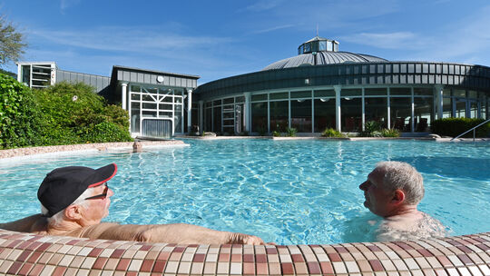 Ein Schwätzchen am Beckenrand bei der Wiedereröffnung der Römerthermen nach der Sanierung im Mai 2025. Martin Gausmann
