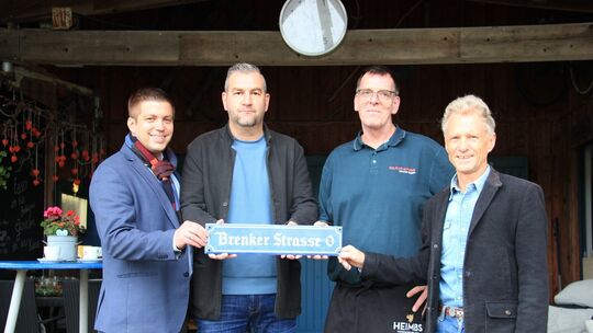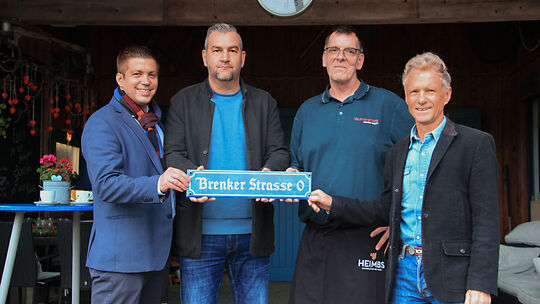 Präsentieren das neue Schild mit der Hausnummer 0: Mathias Koslowski (von links), Dominik Schmitz, Andreas Walz und Thomas Wolff. Martin Ingenhoven