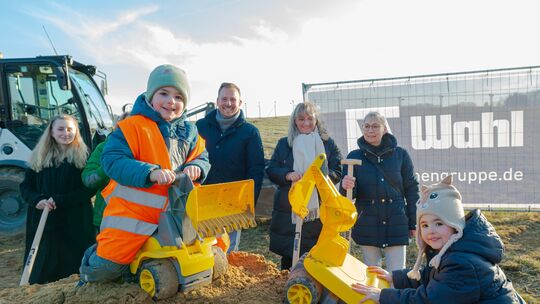 Da griffen auch die zukünftigen Bewohner der Bandorfer Kita schnell zum Spielzeugbagger: Der Spatenstich für die neue Kita am Dienstag sorgte für Freude bei Erzieherinnen und Kindern. Wenn alles gut läuft, ist die Kita im Sommer 2027 bezugsfertig.