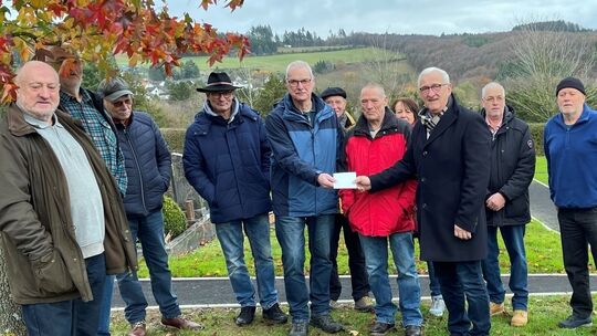 Etliche Bürger aus Schelborn sind dauerhaft ehrenamtlich im Einsatz, um den örtlichen Friedhof in Schuss zu halten. Zuletzt wurden die Wege neu gestaltet. Hierfür bedankte sich Reiner Hilger als Vorsitzender des Verwaltungsrates mit einem Gutschein. Foto: Hans-Josef Schneider Hans-Josef Schneider