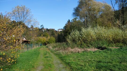In den Bandorfer Wiesen, versteckt hinter Bäumen (rechts) und mit Abstand zu den Wohnhäusern, soll der neue Backes entstehen. Foto: Christian Koniecki. Christian Koniecki
