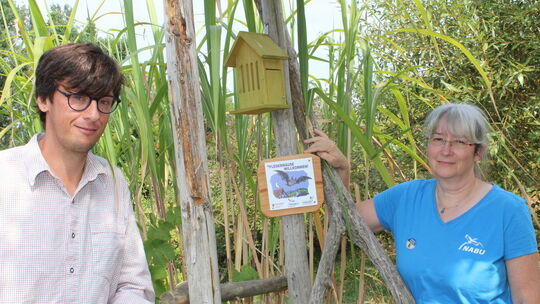 Alexander Haustein und Andrea Brinkhoff mit dem Schild, mit dem unter dem Stichwort „Fledermäuse willkommen“ vom Nabu jene Häuser ausgezeichnet werden, in denen es „Batman“ gut geht. Frank Bugge