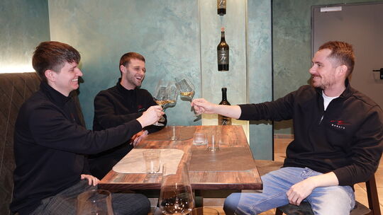 Auf Babsy’s Weinbar stoßen Jonas Wirtz (von links), Janek Koch und Michael Schumacher an. Thomas Weber