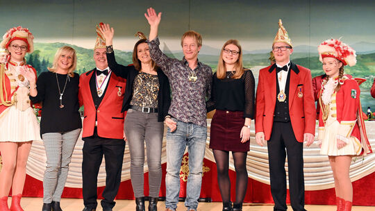 Nach dem Vortanzen noch „in zivil“: Anne und Bernhard Jäger (Mitte) sind das neue Breisiger Prinzenpaar für die nächsten zwei Sessionen in der Quellenstadt. Bis zum Schluss hatte Sitzungspräsident Markus Feix (zweiter von rechts) die Spannung aufrecht gehalten.