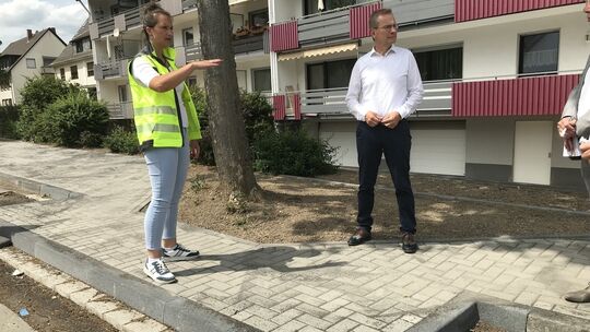 Um die jeweiligen Bäume ist eine Umgehung gebaut worden: Bei einem Termin in der Josef-Hardt-Straße in Bad Bodendorf erläuterte Sofia Lunnebach, Geschäftsführerin der Sinziger Gesellschaft für Entwicklung, Wiederaufbau und Innovation (Gewi), wie die Straße wiederaufgebaut worden und was noch zu machen ist. Foto: Silke Müller Silke Müller