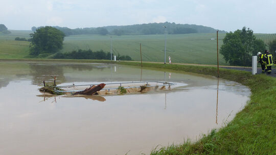 Das Regenrückhaltebecken in Nierendorf war bei einem Unwetter vor einigen Jahren prall gefüllt. Um große Rückhaltebecken geht es auch beim Hochwasserschutz im Ahrtal. Hans-Jürgen Vollrath